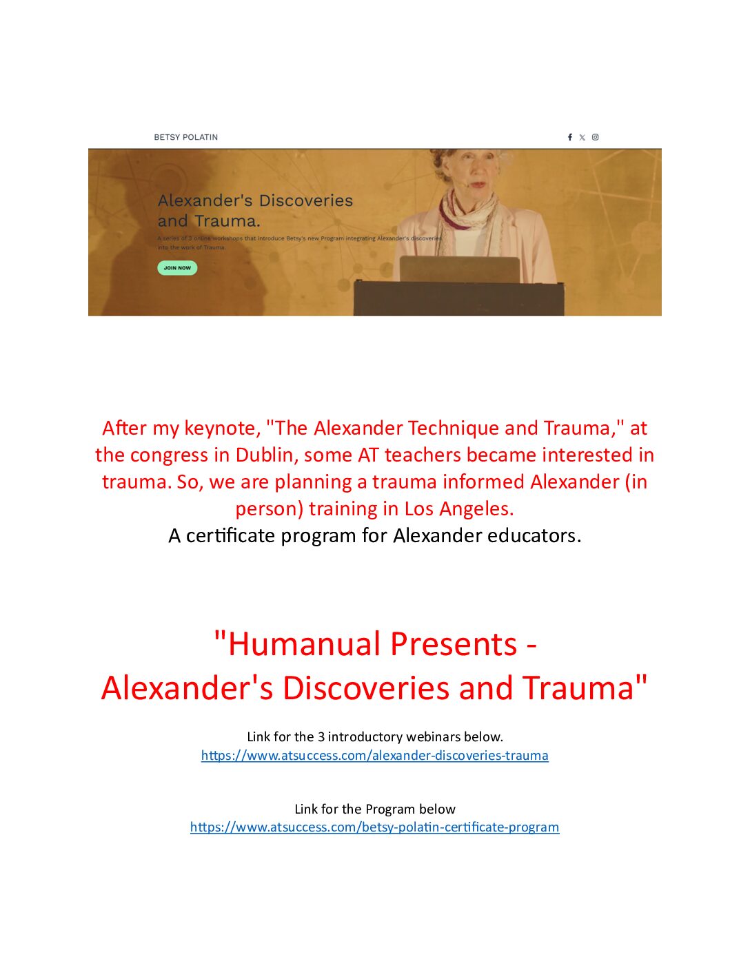 After my keynote, “The Alexander Technique and Trauma,” at the congress in Dublin, some AT teachers became interested in trauma. So, we are planning a trauma informed Alexander (in person) training in Los Angeles.